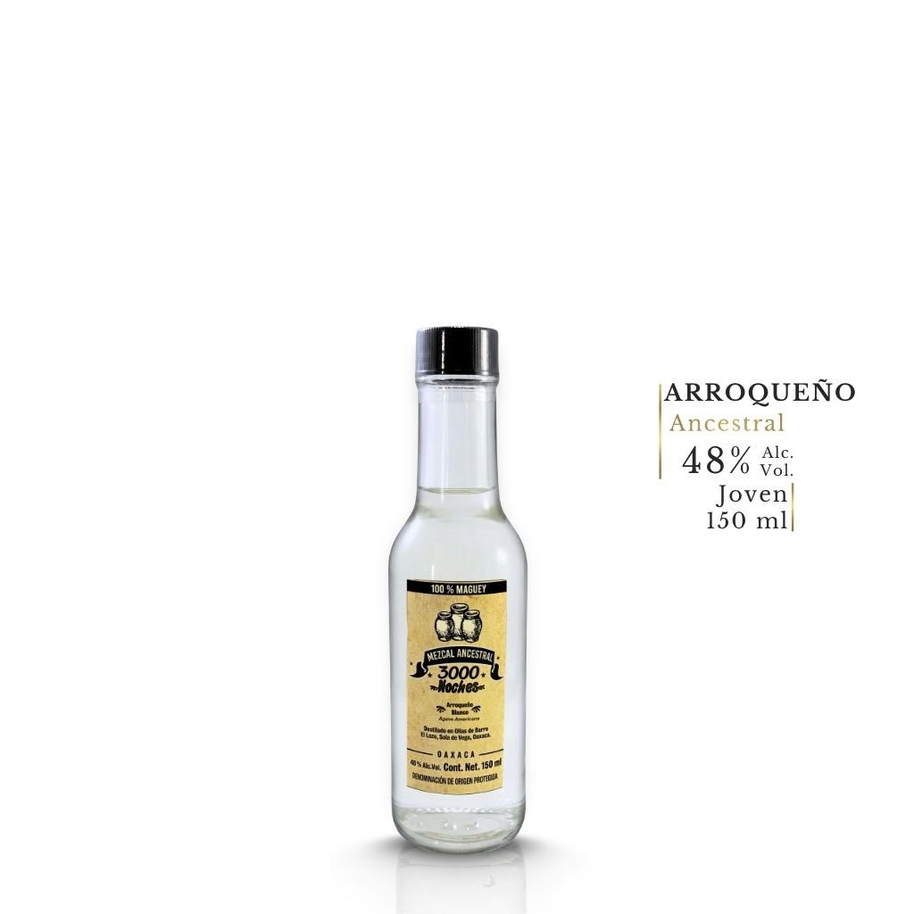 Descubre el Mezcal Ancestral 3000 Noches Arroqueño Blanco, elaborado con 100% Agave Americana en El Lazo, Villa Sola de Vega, Oaxaca. Lo destila el Maestro Mezcalero Ángel Cruz Robles, artesano de una región poco conocida pero profundamente auténtica de la Sierra Sur oaxaqueña. En presentación de 150 ml, esta botella lleva todo el carácter del Arroqueño Ancestral en un formato ideal para descubrirlo, regalarlo o llevar Oaxaca a donde vayas.