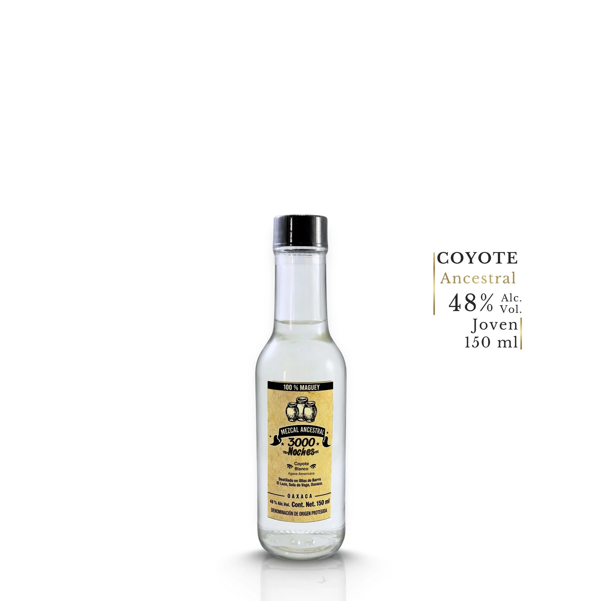 Descubre el Mezcal Ancestral 3000 Noches Coyote Blanco, elaborado con 100% Agave Americana variedad Coyote en El Lazo, Villa Sola de Vega, Oaxaca. Lo destila el Maestro Mezcalero Ángel Cruz Robles, artesano de una de las regiones mezcaleras más auténticas y menos exploradas de la Sierra Sur. En presentación de 150 ml, esta botella lleva todo el carácter del Coyote Ancestral en formato ideal para descubrirlo, coleccionarlo o regalarlo.