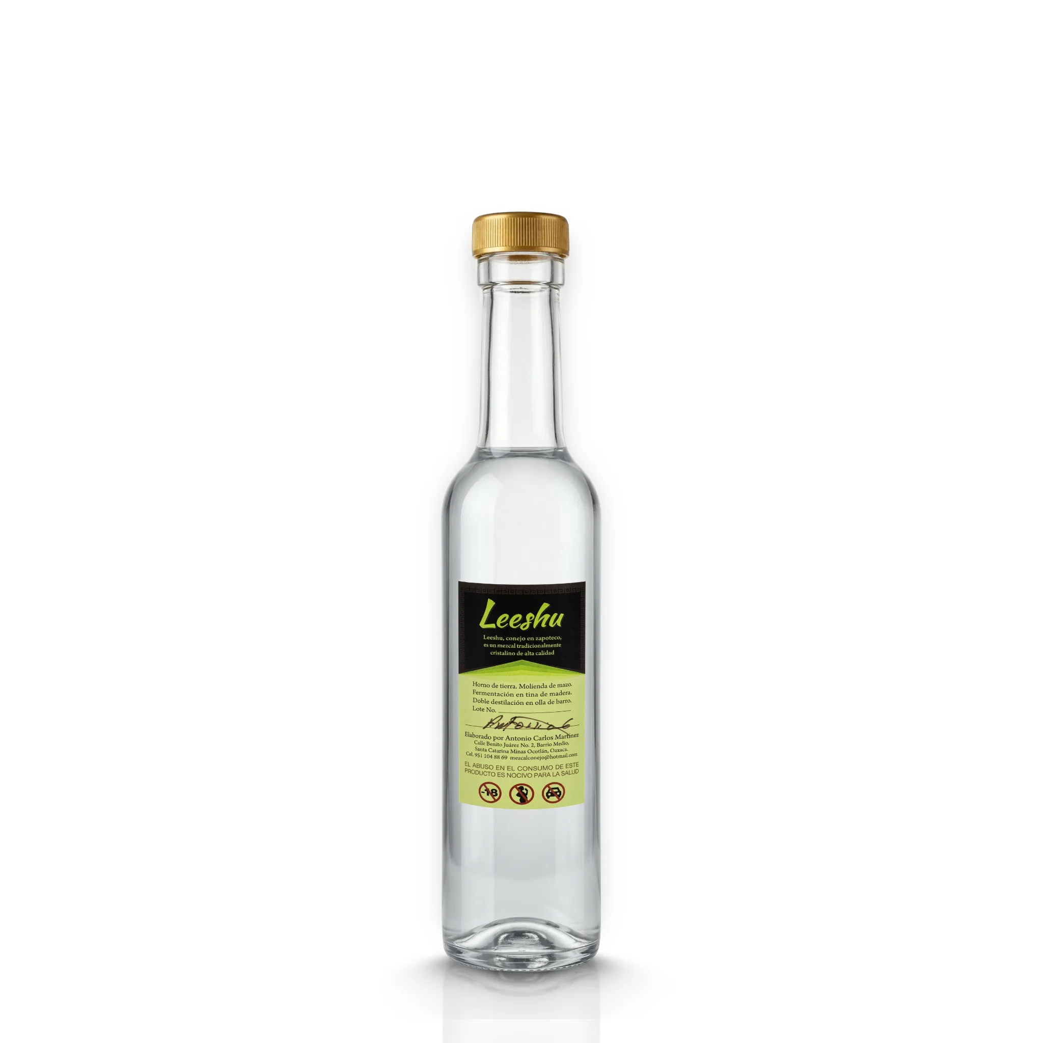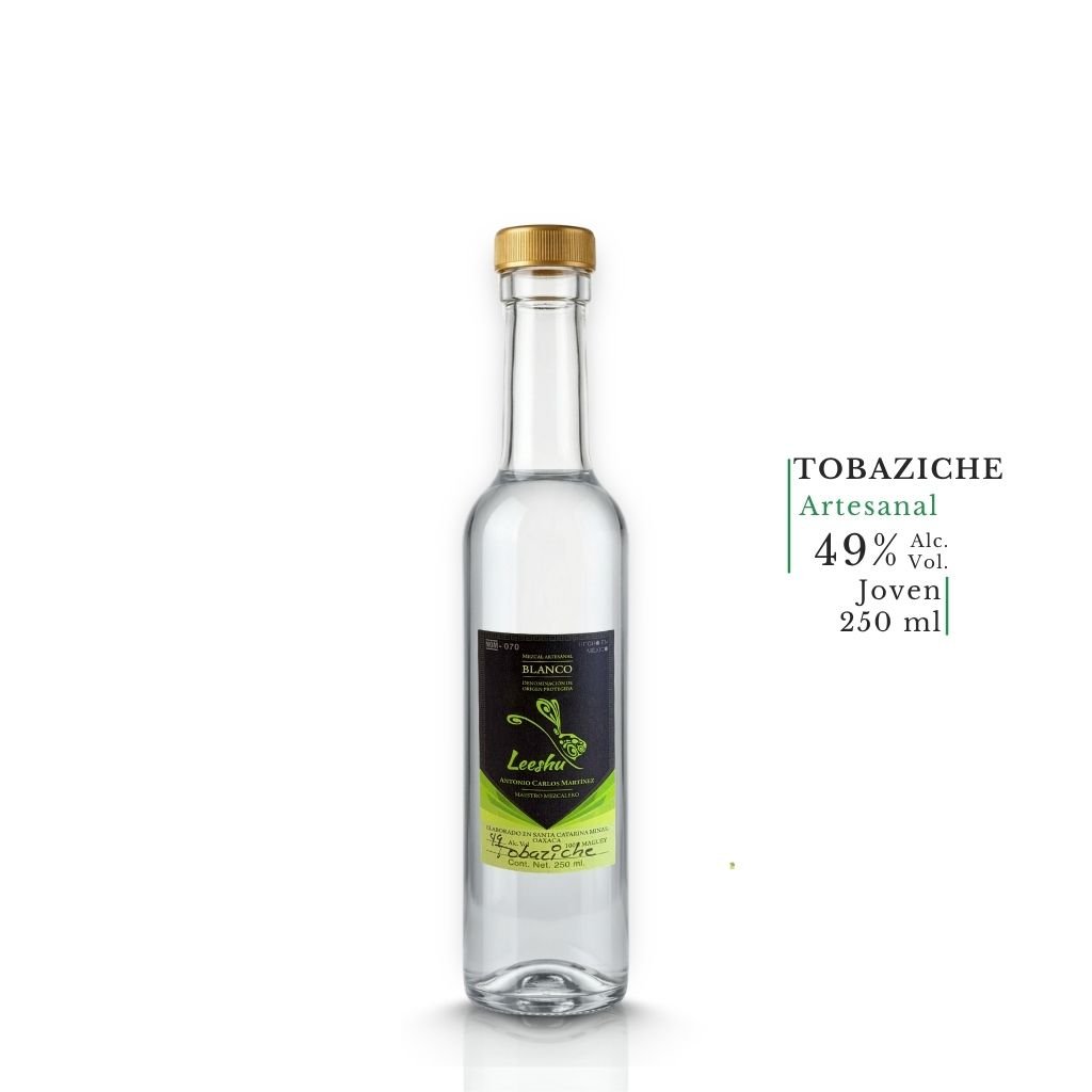 Leeshu utiliza uno de los procesos más completos y auténticos de Santa Catarina Minas: horno de tierra, molienda de maíz, fermentación en tina de madera y doble destilación en olla de barro. La destilación en olla de barro, sello histórico del mezcal minero, aporta a este Tobaziche una capa arcillosa y mineral que lo distingue de cualquier mezcal Artesanal convencional. Con 49% Alc. Vol., expresa toda la potencia del Tobaziche sin concesiones. Registro NOM-070 y Denominación de Origen Protegida.