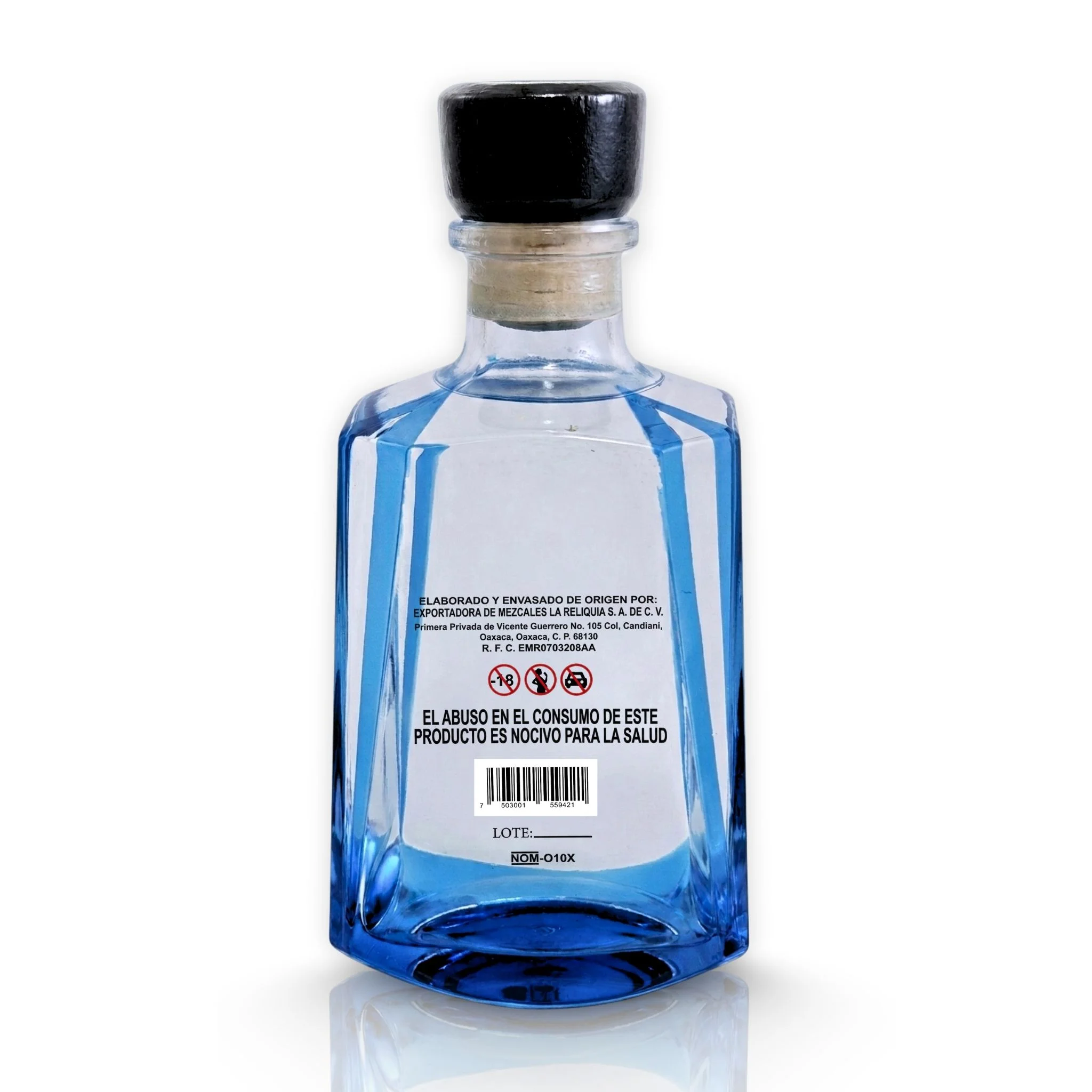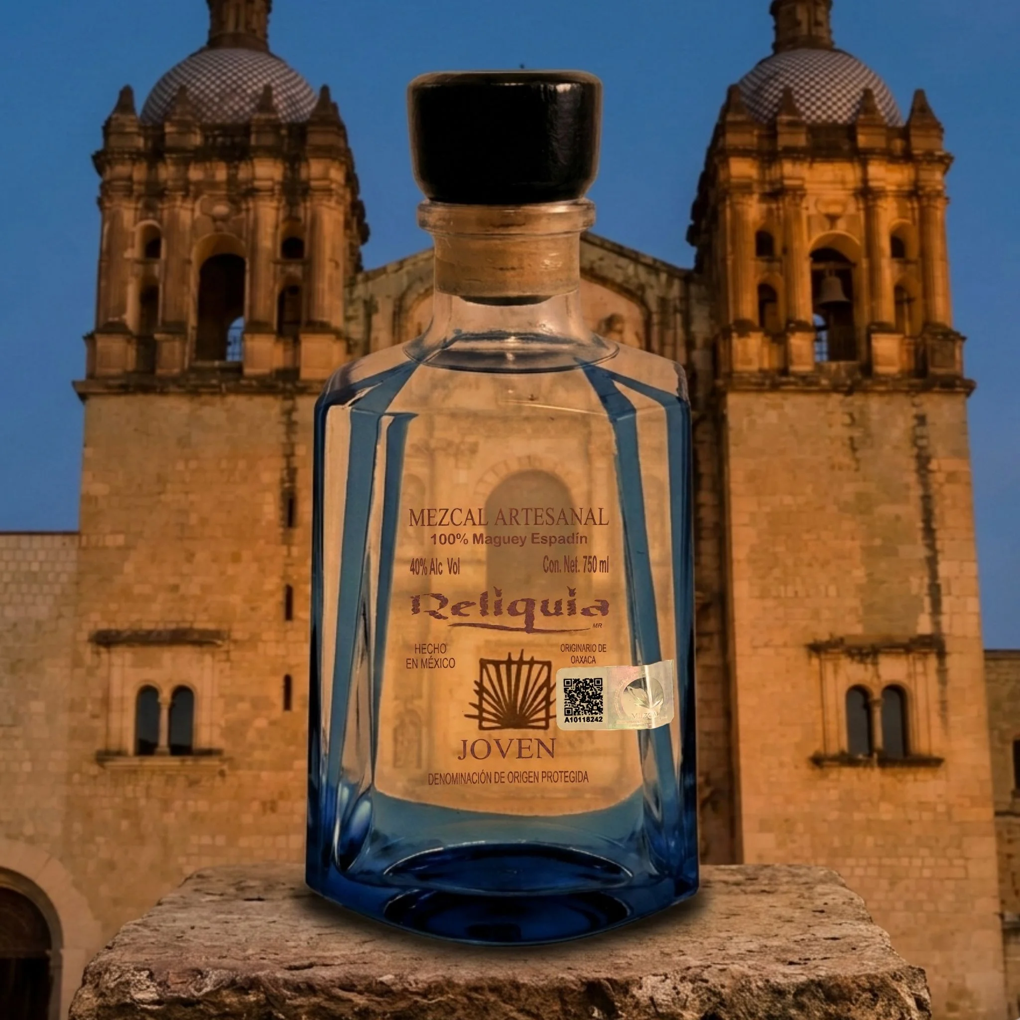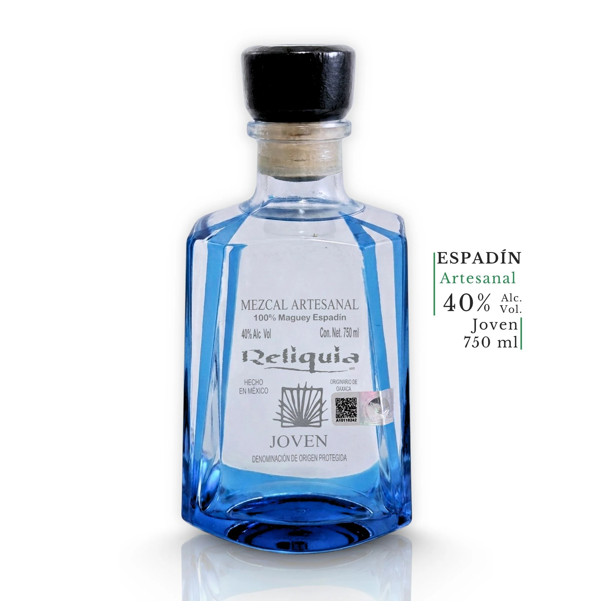 - Mezcal Artesanal Reliquia Espadín Joven, 100% Maguey Espadín, 40% Alc. Vol., 750 ml. Botella rectangular de vidrio azul. Hecho en México, Originario de Oaxaca, Denominación de Origen Protegida.